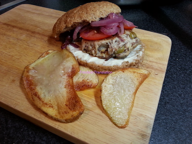 A questo punto non ci resta che assemblare l'hamburger: tagliamo il pomodoro a fette sottili; facciamo a metà il panino, spalmiamolo con la maionese e disponiamoci sopra l'hamburger di sgombro, due fettine di pomodoro e le cipolle caramellate. Chiudiamo con l'altra parte del panino e portiamo in tavola con tante patatine fritte, croccanti all'esterno e morbide al centro.