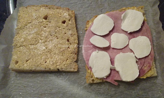 aggiungiamo due fette di prosciutto cotto su ogni quadrato di focaccia, la mozzarella tagliata a fettine,